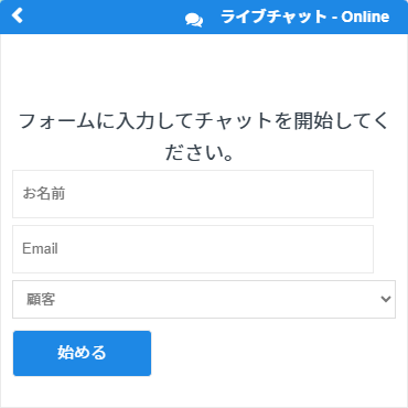 ユーザーが「ライブチャット」ボタンをクリックすると、最初に簡単な入力フォームがあり、お名前・Email・ユーザー種別の選択を行います。