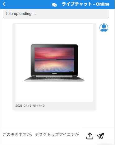 ライブチャット専用のブルーのボットウィンドウでユーザーとのチャットがスタート。ユーザー側から画像をアップロードする機能もあり、スクショなどの情報をスタッフと共有するのに便利です。画像フォーマットは、jpg、png、gif、pdfなどが設定できます。